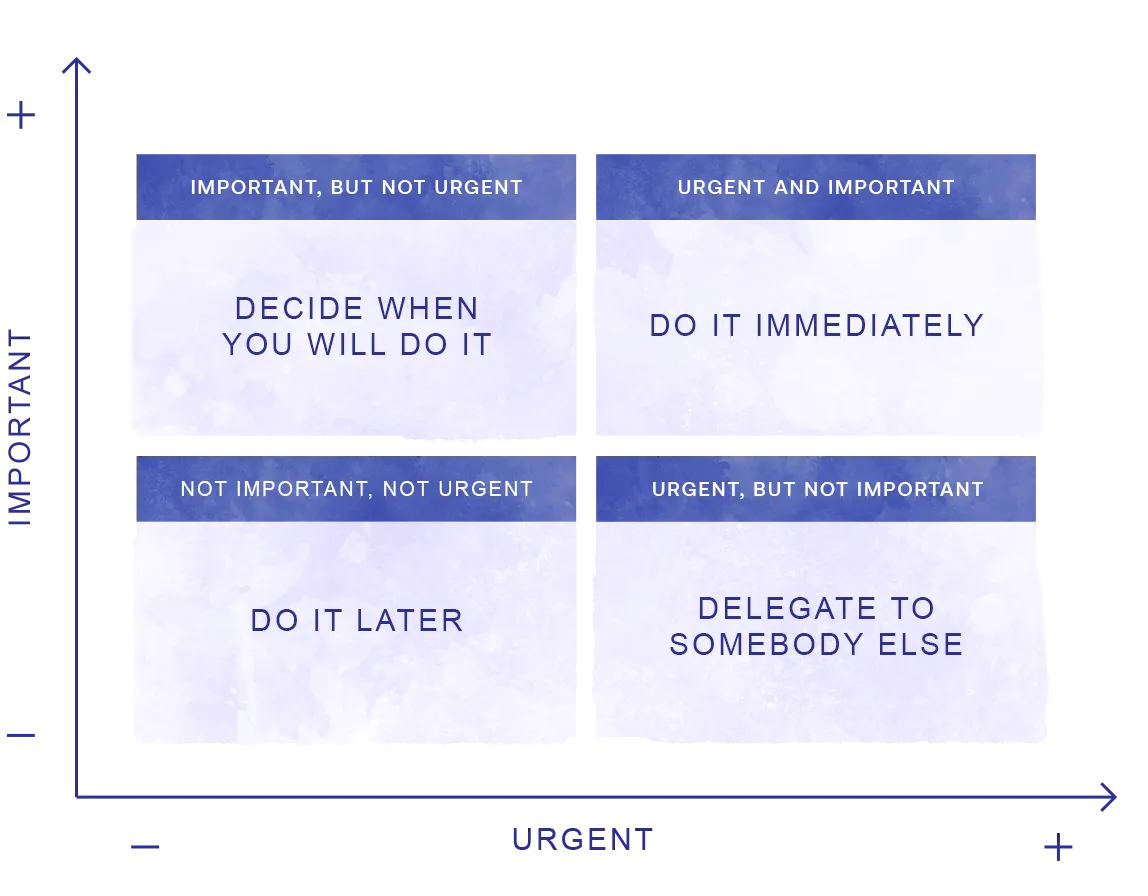 Naše društvo nudi posebna due diligence savjetovanja, tj. izradu dubinske analize procesa i sadržaja procesa, kako bismo klijentu ponudili potpuni uvid u problem, kao i rješenja koja su komplementarna za isti. Tako smo u mogućnosti brzo i učinkovito ponuditi konkretna rješenja za hitne probleme. Naime, upotrebom Eisenhowerove matrice u razgovoru s klijentom osvijestimo dvije vrste problema – hitne i bitne te ih stavljamo u korelaciju hitnosti (velika hitnost/manja hitnost) i važnosti (velika važnost/manja važnost) te tako dobivamo dijagram pomoću kojeg se donose jako bitne ili manje bitne odluke, odmah ili kasnije, samostalno ili delegiranjem nekoj drugoj osobi. Na vrlo jasan i slikovit način, dijagram nam pokazuje koje se sve teme ili problemi trebaju sagledati i adresirati u budućnosti.